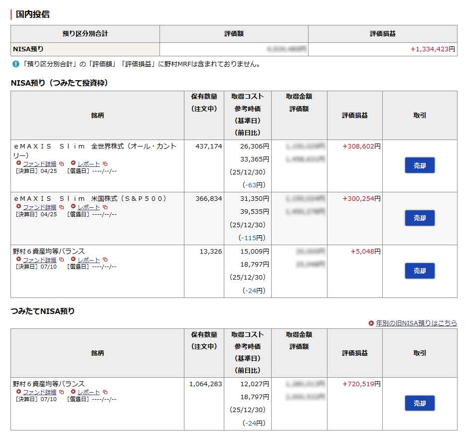 野村のオリジナル商品の「野村6資産均等バランス」も、追加資金なしで今年1年で倍くらいになっています。旧NISAなので期限付きですが手数料がかかってもまだまだホールドしたいと思います。